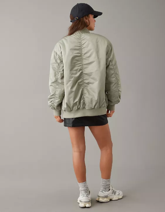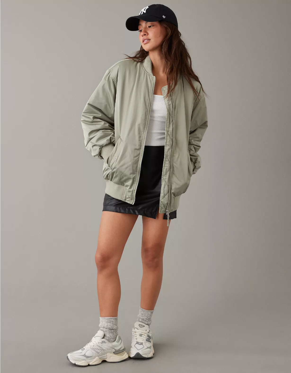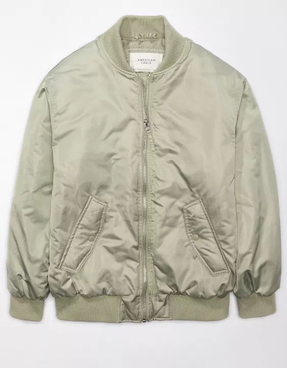 You’ll look fly in this aviator jacket, featuring satin-inspired fabric for some extra shine.